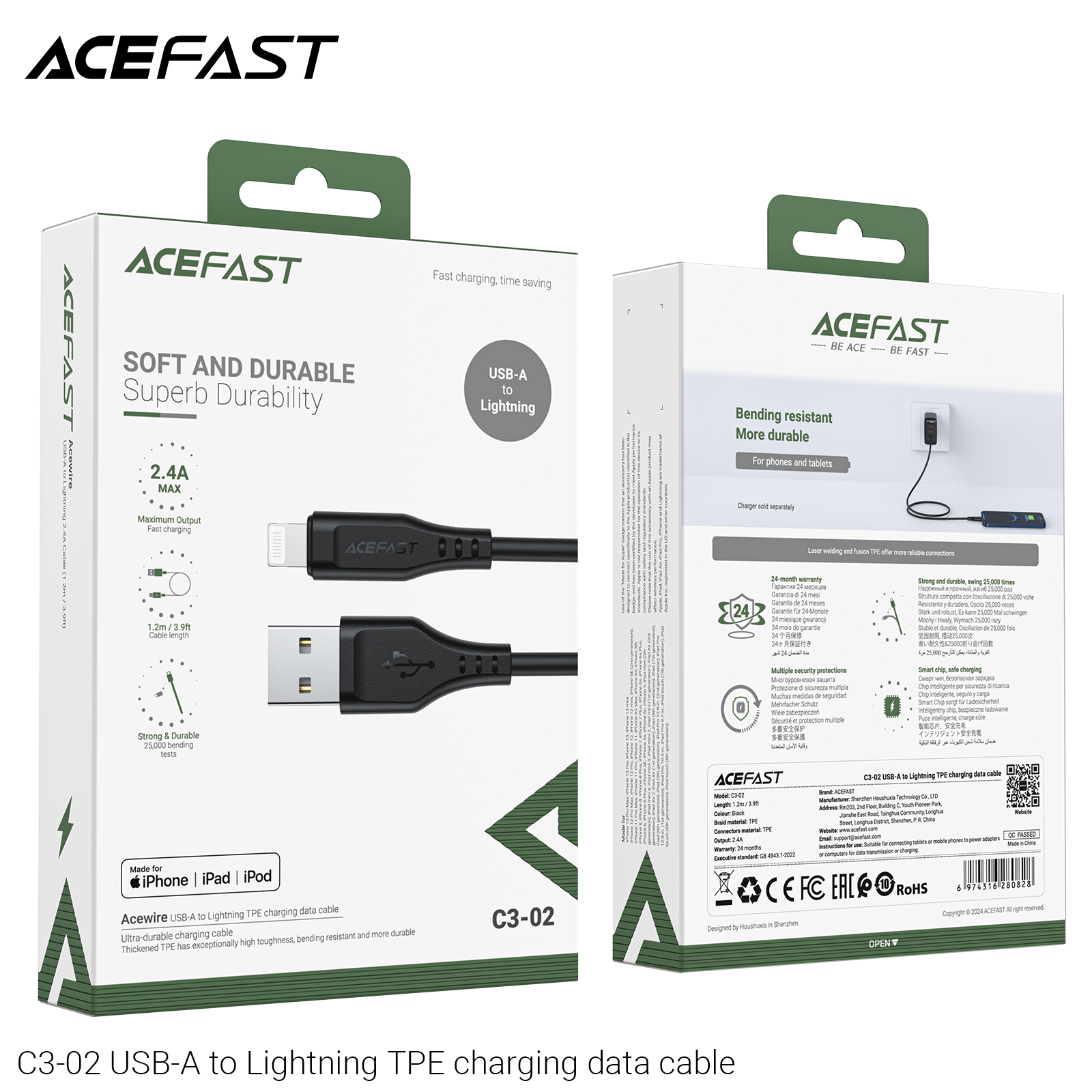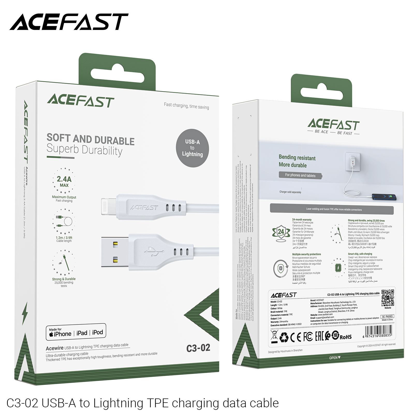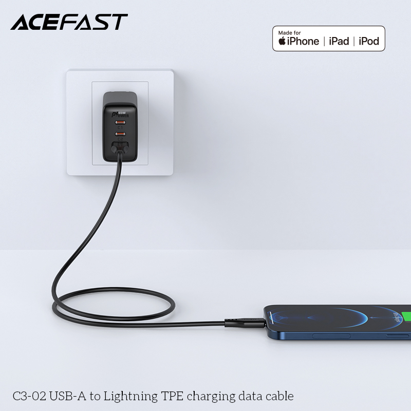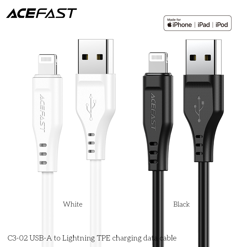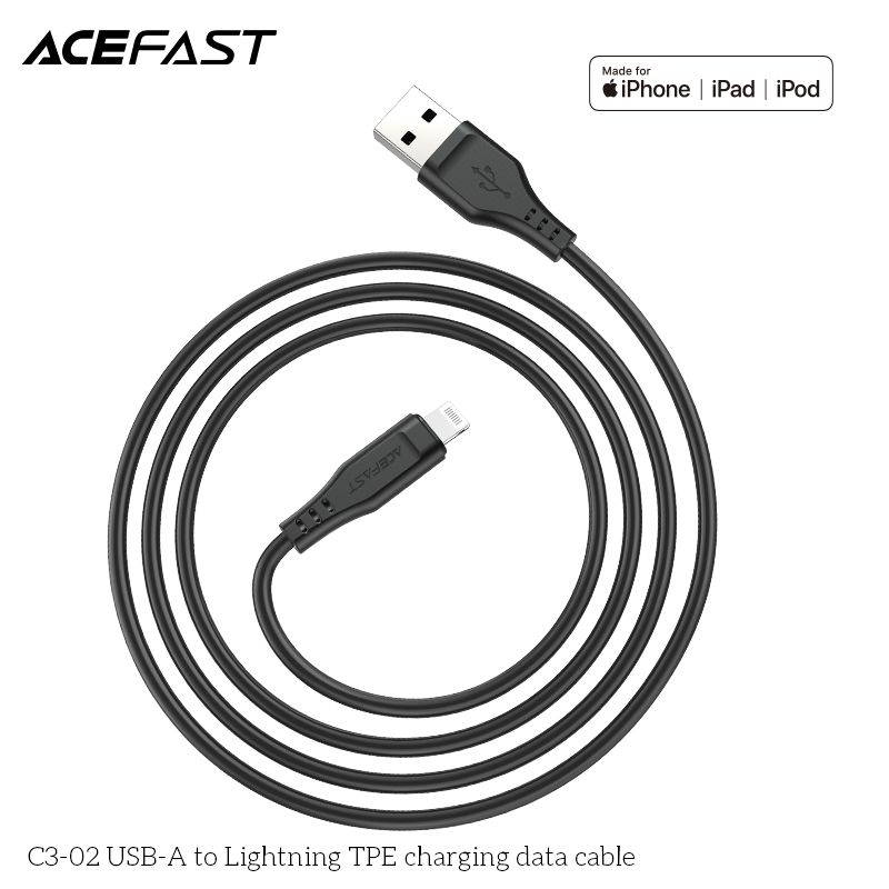 The ACEFAST C3-02 USB-A to Lightning TPE Charging Data Cable ensures seamless connectivity. It features a USB-A connector on one end and a Lightning connector on the other. The TPE material provides durability and flexibility. Perfect for charging and data transfer, this cable is a reliable choice for everyday use.